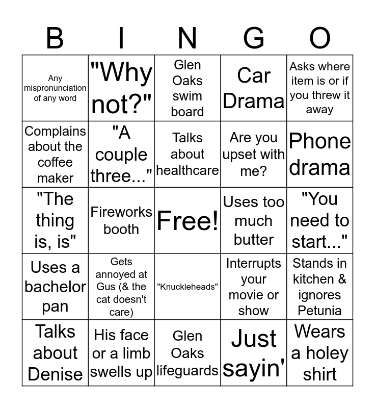 This bingo card has a free space and 24 words: Gets annoyed at Gus (& the cat doesn't care), His face or a limb swells up, Talks about healthcare, Talks about Denise, Asks where item is or if you threw it away, Any mispronunciation of any word, Complains about the coffee maker, "Why not?", Uses too much butter, "Knuckleheads", Are you upset with me?, "The thing is, is", Interrupts your movie or show, Stands in kitchen & ignores Petunia, "A couple three...", Just sayin', "You need to start...", Glen Oaks swim board, Phone drama, Fireworks booth, Wears a holey shirt, Uses a bachelor pan, Car Drama and Glen Oaks lifeguards.