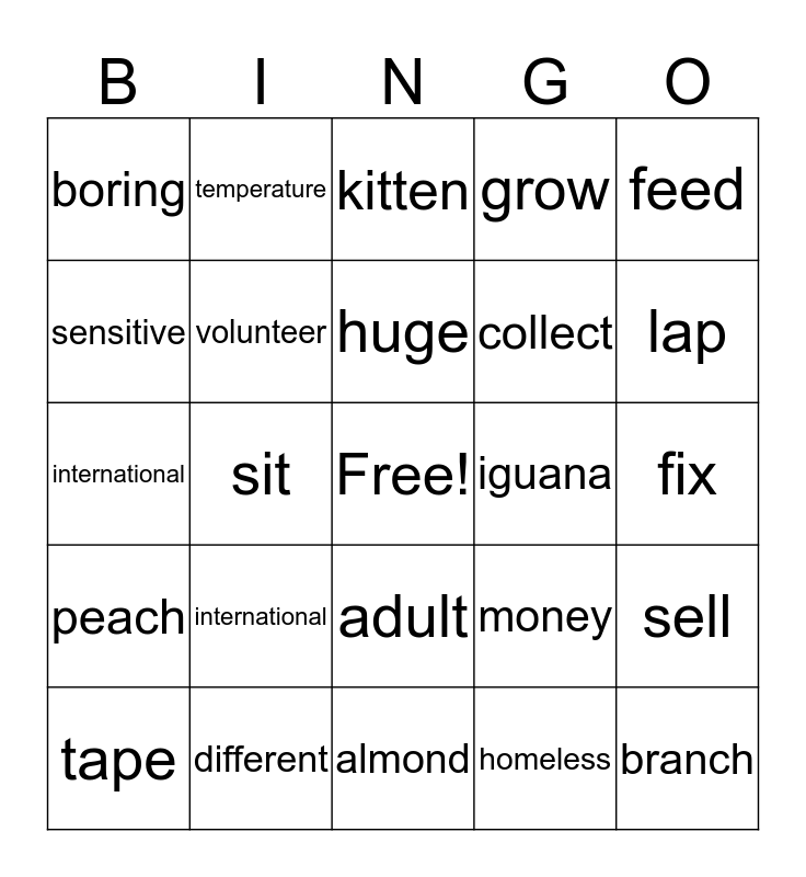 This bingo card has a free space and 24 words: international, different, huge, tape, feed, boring, sensitive, temperature, iguana, adult, collect, international, money, sell, volunteer, homeless, fix, kitten, lap, sit, branch, peach, grow and almond.