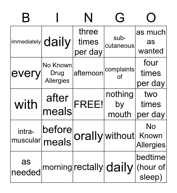 This bingo card has a free space and 24 words: before meals, morning, afternoon, as needed, as much as wanted, immediately, every, daily, nothing by mouth, orally, complaints of, with, without, No Known Allergies, No Known Drug Allergies, daily, two times per day, three times per day, four times per day, after meals, bedtime (hour of sleep), intra-muscular, sub- cutaneous and rectally.