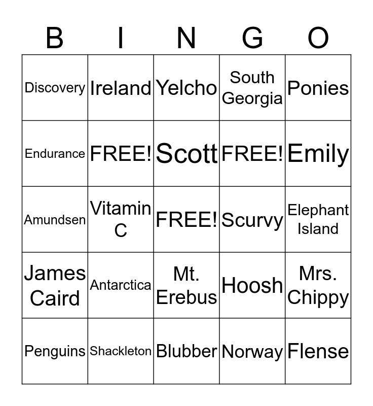 This bingo card has a free space and 24 words: Antarctica, Shackleton, Scott, Penguins, Ponies, Discovery, Endurance, Ireland, Scurvy, Mt. Erebus, FREE!, Amundsen, Hoosh, Mrs. Chippy, FREE!, Norway, Elephant Island, Yelcho, Emily, Vitamin C, Flense, James Caird, South Georgia and Blubber.
