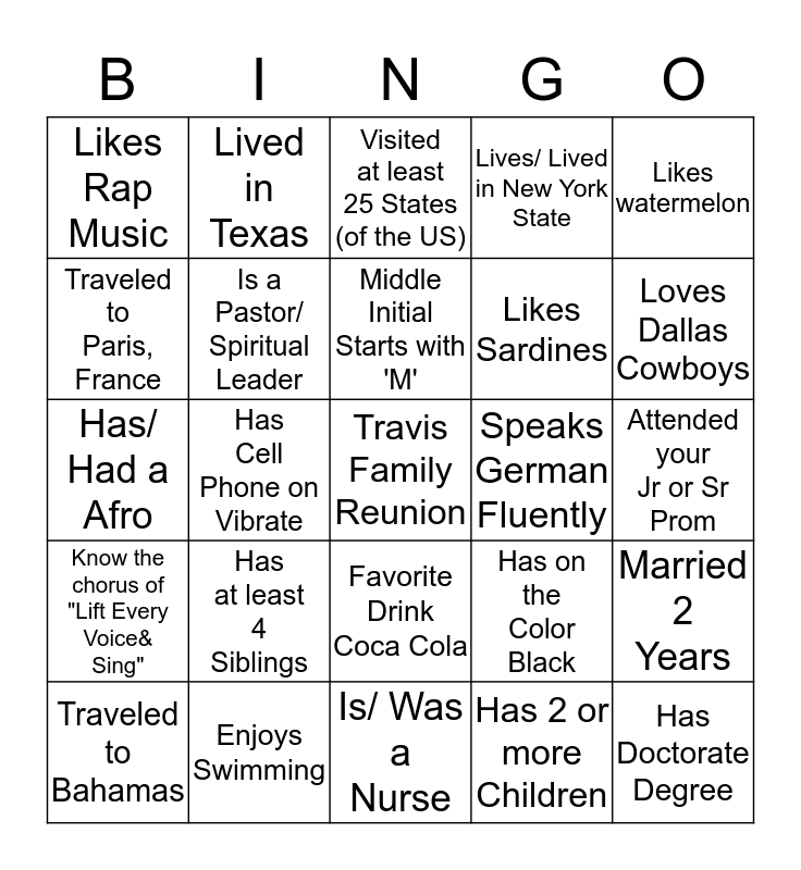 This bingo card has a free space and 24 words: Has at least 4 Siblings, Enjoys Swimming, Middle Initial Starts with 'M', Traveled to Bahamas, Likes watermelon, Likes Rap Music, Traveled to Paris, France, Lived in Texas, Speaks German Fluently, Favorite Drink Coca Cola, Likes Sardines, Has/ Had a Afro, Has on the Color Black, Married 2 Years, Is a Pastor/ Spiritual Leader, Has 2 or more Children, Attended your Jr or Sr Prom, Visited at least 25 States (of the US), Loves Dallas Cowboys, Has Cell Phone on Vibrate, Has Doctorate Degree, Know the chorus of "Lift Every Voice& Sing", Lives/ Lived in New York State and Is/ Was a Nurse.