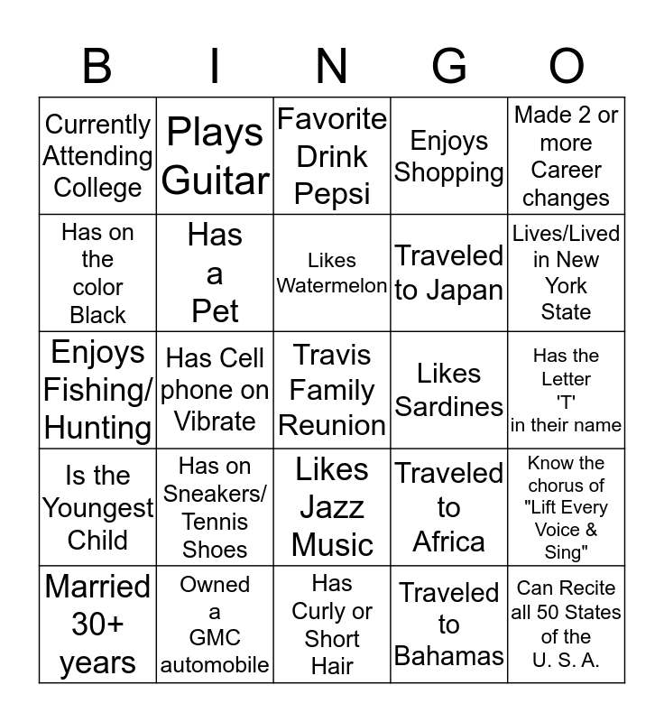 This bingo card has a free space and 24 words: Has on Sneakers/ Tennis Shoes, Owned a GMC automobile, Likes Watermelon, Married 30+ years, Made 2 or more Career changes, Currently Attending College, Has on the color Black, Plays Guitar, Likes Sardines, Likes Jazz Music, Traveled to Japan, Enjoys Fishing/ Hunting, Traveled to Africa, Know the chorus of "Lift Every Voice & Sing", Has a Pet, Traveled to Bahamas, Has the Letter 'T' in their name, Favorite Drink Pepsi, Lives/Lived in New York State, Has Cell phone on Vibrate, Can Recite all 50 States of the U. S. A., Is the Youngest Child, Enjoys Shopping and Has Curly or Short Hair.