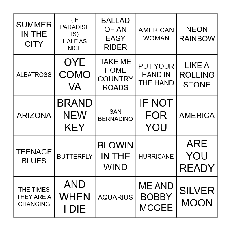 This bingo card has 25 words: BUTTERFLY, AQUARIUS, TAKE ME HOME COUNTRY ROADS, THE TIMES THEY ARE A CHANGING, NEON RAINBOW, SUMMER IN THE CITY, ALBATROSS, (IF PARADISE IS) HALF AS NICE, IF NOT FOR YOU, BLOWIN IN THE WIND, PUT YOUR HAND IN THE HAND, ARIZONA, HURRICANE, ARE YOU READY, OYE COMO VA, SILVER MOON, AMERICA, BALLAD OF AN EASY RIDER, LIKE A ROLLING STONE, BRAND NEW KEY, SAN BERNADINO, AND WHEN I DIE, TEENAGE BLUES, AMERICAN WOMAN and ME AND BOBBY MCGEE.