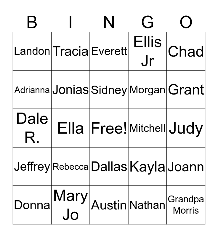 This bingo card has a free space and 43 words: Debby, Grandpa Morris, Grandma Norma, Donna, Ellis, Nathan, Everett, Lydia, Chad, Mary Jo, Ellis Jr, Mitchell, Dallas, Rebecca, Megan, Austin, Autumn, Dale R., Jenise, Grant, Tracia, Jaron, Quinton, Landon, Harmoni, Judy, Dale H., Jennifer, Kayla, Jeffrey, Christopher, Joann, Nevin, Ella, Aliyah, Sanford, Carmen, Sidney, Adrianna, Morgan, Marinna, Jonias and Miciah.