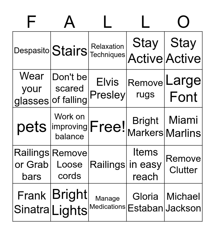 This bingo card has a free space and 24 words: Remove Loose cords, Bright Lights, Elvis Presley, Frank Sinatra, Stay Active, Despasito, Wear your glasses, Stairs, Bright Markers, Railings, Remove rugs, pets, Items in easy reach, Remove Clutter, Don't be scared of falling, Gloria Estaban, Miami Marlins, Relaxation Techniques, Large Font, Work on improving balance, Michael Jackson, Railings or Grab bars, Stay Active and Manage Medications.