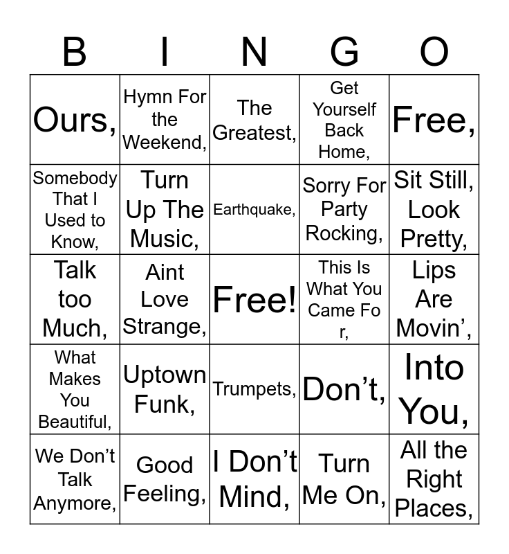 This bingo card has a free space and 60 words: Stronger,, Good Feeling,, Brokenhearted,, What Makes You Beautiful,, Turn Me On,, Feel So Close,, Turn Up The Music,, We Run The Night,, Sorry For Party Rocking,, Give Me All Your Luvin’,, Get Yourself Back Home,, It Will Rain,, Somebody That I Used to Know,, Drive By,, Springsteen,, Ours,, All the Right Places,, Free,, Run Dat Back,, Earthquake,, This Is What You Came For,, The Greatest,, We Don’t Talk Anymore,, Into You,, Me too,, Make Me….,, Never Be Like You,, Starving,, Sit Still, Look Pretty,, This Girl,, Greenlight,, Luv,, Rise,, Unsteady,, Hymn For the Weekend,, Mama Said,, Lovesick,, Aint Love Strange,, ILYSB,, Talk too Much,, Fool’s Gold,, Uptown Funk,, Lips Are Movin’,, Animals,, Don’t,, Love Me Harder,, I’m Not The Only One,, Steal My Girl,, The Heart Wants What It Wants,, Trumpets,, I Don’t Mind,, Boom Clap,, Waves,, Blame,, A Sky Full Of Stars,, Shut Up And Dance,, Knock Me Out,, Who are You Loving Now,, Uncover, and Hold The Line.