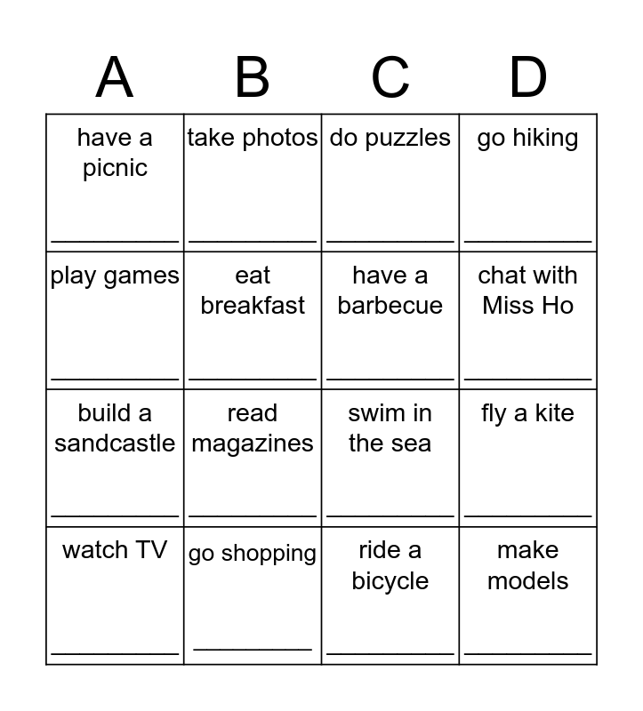 This bingo card has 16 words: go shopping _________, fly a kite _________, do puzzles _________, have a picnic _________, build a sandcastle _________, take photos _________, swim in the sea _________, ride a bicycle _________, play games _________, eat breakfast _________, watch TV _________, go hiking _________, read magazines _________, chat with Miss Ho _________, have a barbecue _________ and make models _________.