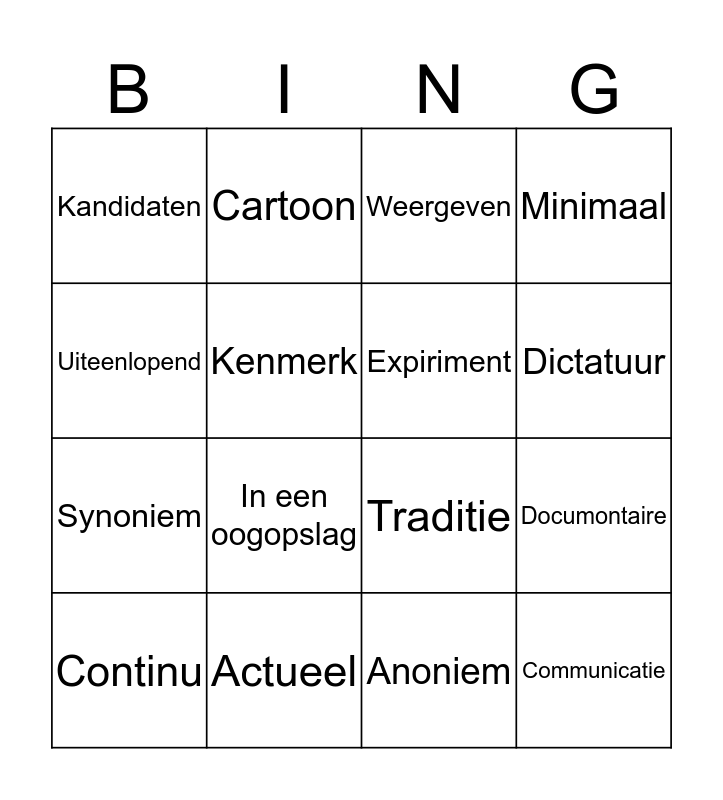 This bingo card has 16 words: Actueel, Documontaire, Weergeven, Kandidaten, Synoniem, Cartoon, Traditie, Anoniem, Uiteenlopend, Kenmerk, Continu, Minimaal, In een oogopslag, Dictatuur, Expiriment and Communicatie.