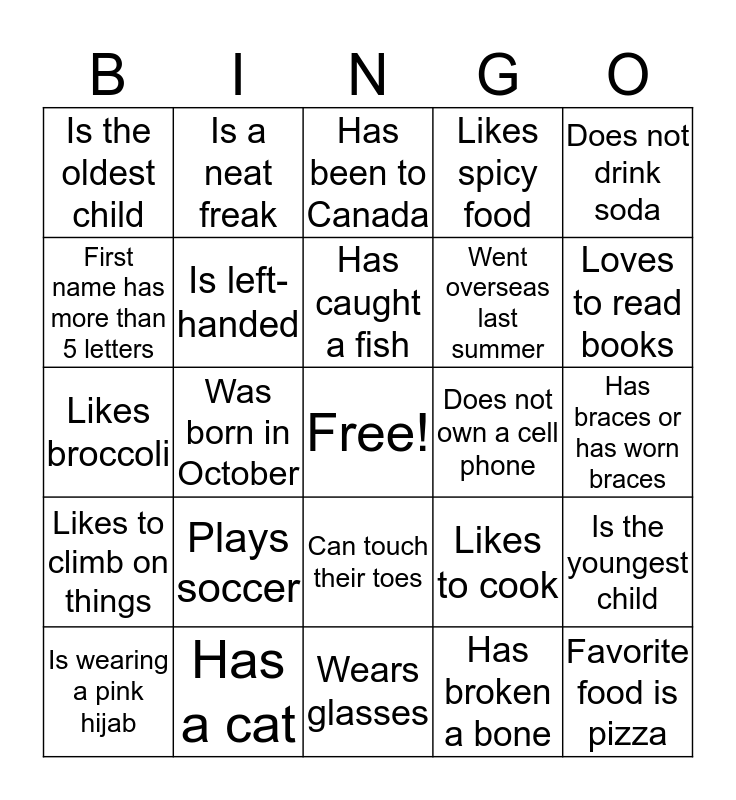This bingo card has a free space and 29 words: Is wearing a pink hijab, Ate chocolate today, Was born in October, Wears socks to bed, Is the oldest child, Has been to Canada, Is left-handed, Plays soccer, Does not own a cell phone, Has a cat, Has braces or has worn braces, Favorite food is pizza, Wears glasses, Has broken a bone, Loves to read books, Hates spiders, Can touch their toes, Likes to climb on things, Does not drink soda, Likes broccoli, Likes to cook, Is wearing a blue shirt, Went overseas last summer, First name has more than 5 letters, Likes spicy food, Is a neat freak, Is the youngest child, Has caught a fish and Has brown eyes.