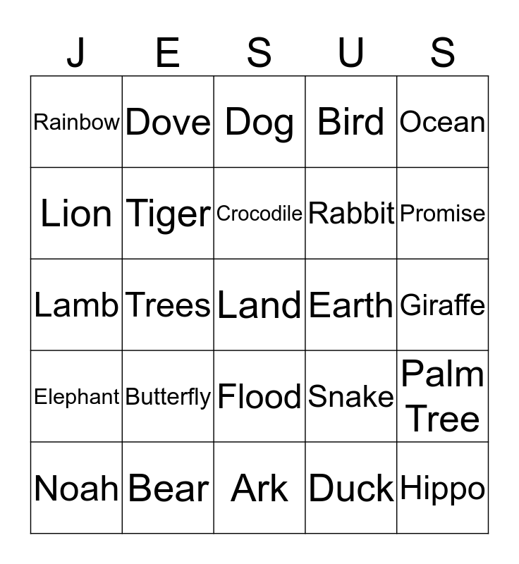 This bingo card has 25 words: Elephant, Bear, Land, Duck, Ocean, Rainbow, Dove, Dog, Earth, Palm Tree, Lion, Tiger, Ark, Snake, Promise, Noah, Trees, Crocodile, Rabbit, Giraffe, Lamb, Butterfly, Flood, Bird and Hippo.