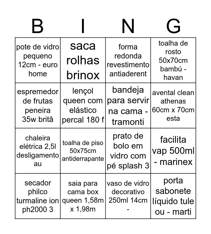 This bingo card has 16 words: saia para cama box queen 1,58m x 1,98m, facilita vap 500ml - marinex, forma redonda revestimento antiaderent, pote de vidro pequeno 12cm - euro home, chaleira elétrica 2,5l desligamento au, saca rolhas brinox, prato de bolo em vidro com pé splash 3, vaso de vidro decorativo 250ml 14cm -, espremedor de frutas peneira 35w britâ, lençol queen com elástico percal 180 f, secador philco turmaline ion ph2000 3, toalha de rosto 50x70cm bambú - havan, toalha de piso 50x75cm antiderrapante, avental clean athenas 60cm x 70cm esta, bandeja para servir na cama - tramonti and porta sabonete líquido tule ou - marti.