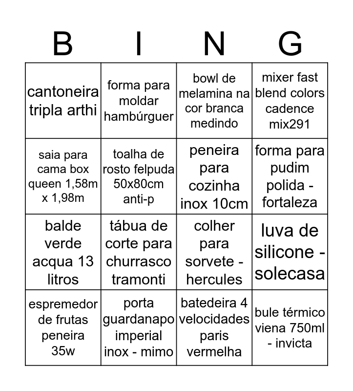 This bingo card has 16 words: porta guardanapo imperial inox - mimo, luva de silicone - solecasa, bowl de melamina na cor branca medindo, cantoneira tripla arthi, balde verde acqua 13 litros, forma para moldar hambúrguer, colher para sorvete - hercules, batedeira 4 velocidades paris vermelha, saia para cama box queen 1,58m x 1,98m, toalha de rosto felpuda 50x80cm anti-p, espremedor de frutas peneira 35w, mixer fast blend colors cadence mix291, tábua de corte para churrasco tramonti, forma para pudim polida - fortaleza, peneira para cozinha inox 10cm and bule térmico viena 750ml - invicta.
