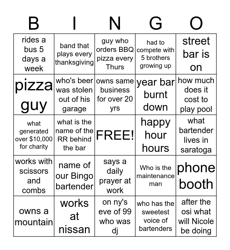 This bingo card has a free space and 24 words: name of our Bingo bartender, works at nissan, owns same business for over 20 yrs, owns a mountain, street bar is on, rides a bus 5 days a week, pizza guy, band that plays every thanksgiving, happy hour hours, says a daily prayer at work, year bar burnt down, what generated over $10,000 for charity, Who is the maintenance man, phone booth, who's beer was stolen out of his garage, who has the sweetest voice of bartenders, what bartender lives in saratoga, guy who orders BBQ pizza every Thurs, how much does it cost to play pool, what is the name of the RR behind the bar, after the osi what will Nicole be doing, works with scissors and combs, had to compete with 5 brothers growing up and on ny's eve of 99 who was dj.