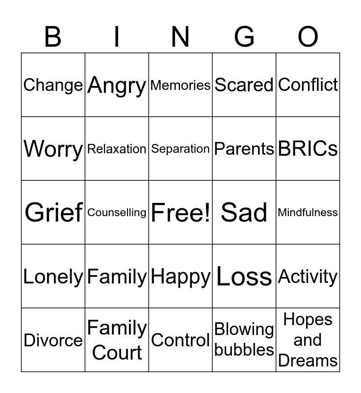 This bingo card has a free space and 24 words: Family, Family Court, Separation, Divorce, Conflict, Change, Worry, Angry, Sad, Happy, Parents, Grief, Loss, Activity, Relaxation, Blowing bubbles, Mindfulness, Memories, BRICs, Counselling, Hopes and Dreams, Lonely, Scared and Control.
