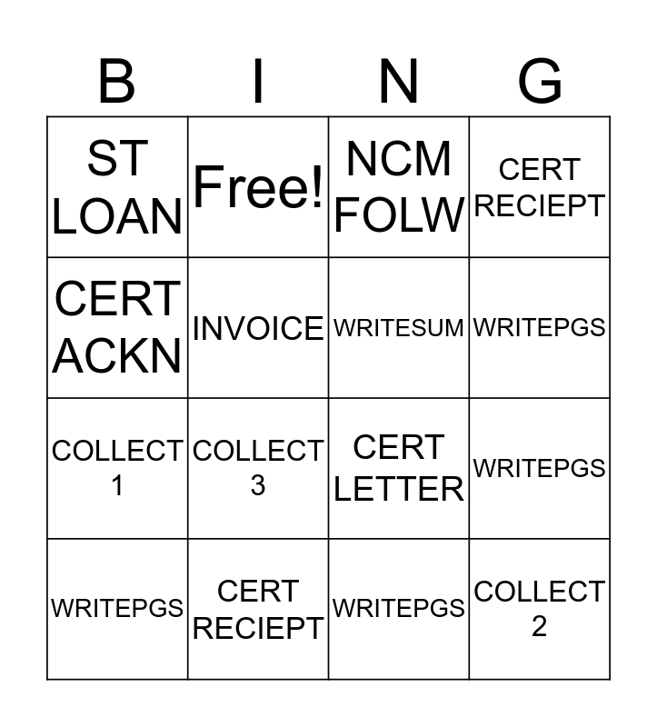 This bingo card has 19 words: CERT LETTER, WRITEPGS, NCM FOLW, COLLECT 2, WRITEPGS, CERT ACKN, WRITEPGS, ST LOAN, Free!, COLLECT 1, COLLECT 3, INVOICE, WRITESUM, CERT RECIEPT, WRITEPGS, COLLECT 2, CERT RECIEPT, WRITEPGS and COLLECT 3.