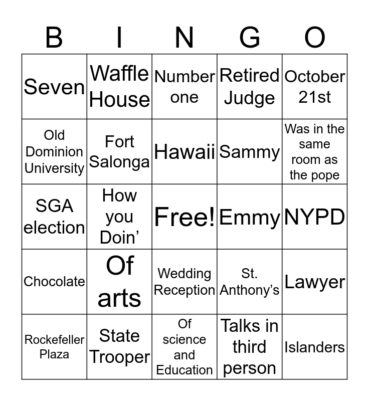 This bingo card has a free space and 47 words: Mets, Islanders, Greek Village Painting, Of science and Education, Of arts, President Nixon, Waffle House, Little Hawaiian, Old Dominion University, Germaphobe, Fort Salonga, Retired Judge, Lawyer, St. Anthony’s, Cookies will make me cuter, Director of Housing Dalton State, Hawaii, Emmy, February 28th, October 21st, How you Doin’, Talks in third person, Seven, Sammy, Patrick, Was in the same room as the pope, Rockefeller Plaza, Washington DC, Wedding Reception, Chocolate, “Okay, Ready, Billie Joel, Levain Bakery, HE MAN Movie, “Little Work Big Bang”, State Trooper, NYPD, Disney, No, college, Student Government, Number one, SGA election, Splash Mountain, December 31, Sophomore Class and Notre Dame.