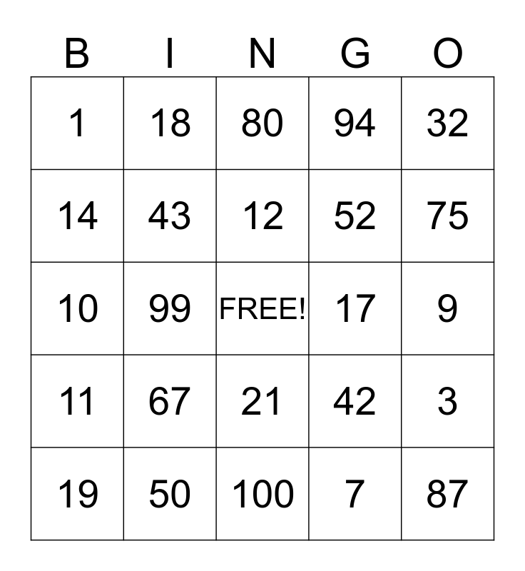 This bingo card has a free space and 24 words: 67, 50, 12, 19, 32, 1, 14, 18, 17, 21, 52, 10, 42, 3, 43, 7, 9, 80, 75, 99, 87, 11, 94 and 100.