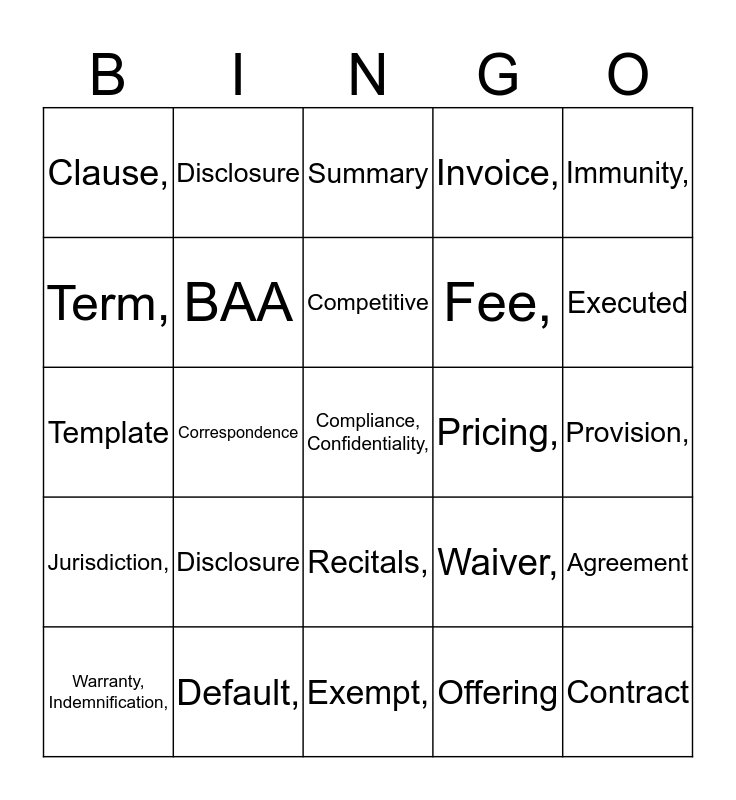 This bingo card has 54 words: FREE!, Jurisdiction,, District,, Exhibit,, Recitals,, Payment,, Invoice,, Contractor,, Term,, Termination,, Clause,, Insurance,, Default,, Warranty, Indemnification,, Tax,, Exempt,, Compliance, Confidentiality,, Fee,, Attorney,, Provision,, Waiver,, Limitation,, Pricing,, Immunity,, Disclosure,, Disclosure, Witness, Qualifications, Requirement, Offering, Statement, Attachment, Addendum, Amendment, Summary, Liability, Template, Agreement, Contract, BAA, Recitals, Contractor, Vendor, Legal, Disclosure, HIPAA, Compensation, Service, Competitive, Correspondence, Executed, Draft, Requisition and Expiration.