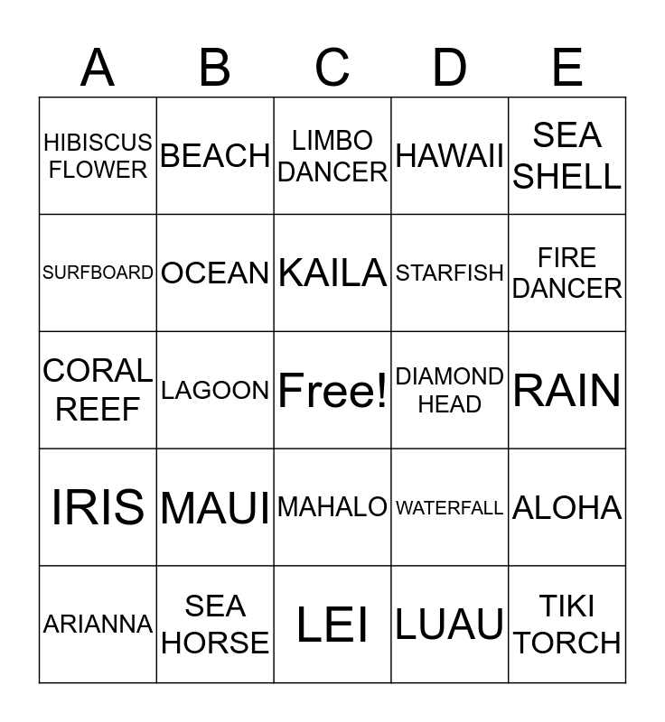 This bingo card has a free space and 24 words: MAUI, SEA HORSE, KAILA, ARIANNA, SEA SHELL, HIBISCUS FLOWER, SURFBOARD, BEACH, DIAMOND HEAD, MAHALO, STARFISH, CORAL REEF, WATERFALL, ALOHA, OCEAN, LUAU, RAIN, LIMBO DANCER, FIRE DANCER, LAGOON, TIKI TORCH, IRIS, HAWAII and LEI.