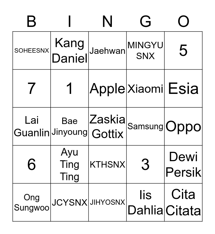 This bingo card has a free space and 24 words: Ayu Ting Ting, JCYSNX, Apple, Ong Sungwoo, 5, SOHEESNX, 7, Kang Daniel, Samsung, KTHSNX, Xiaomi, Lai Guanlin, 3, Dewi Persik, 1, Iis Dahlia, Oppo, Jaehwan, Esia, Bae Jinyoung, Cita Citata, 6, MINGYU SNX and JIHYOSNX.