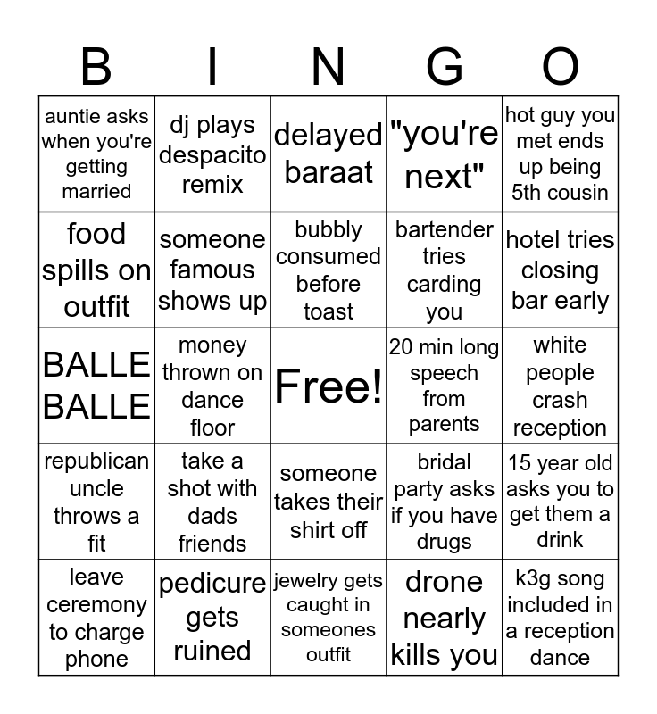 This bingo card has a free space and 24 words: take a shot with dads friends, pedicure gets ruined, bubbly consumed before toast, leave ceremony to charge phone, hot guy you met ends up being 5th cousin, auntie asks when you're getting married, food spills on outfit, dj plays despacito remix, 20 min long speech from parents, someone takes their shirt off, bartender tries carding you, BALLE BALLE, bridal party asks if you have drugs, 15 year old asks you to get them a drink, someone famous shows up, drone nearly kills you, white people crash reception, delayed baraat, hotel tries closing bar early, money thrown on dance floor, k3g song included in a reception dance, republican uncle throws a fit, "you're next" and jewelry gets caught in someones outfit.