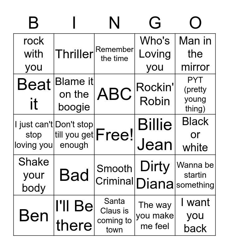 This bingo card has a free space and 24 words: Bad, I'll Be there, ABC, Ben, Man in the mirror, rock with you, Beat it, Thriller, Billie Jean, Smooth Criminal, Rockin' Robin, I just can't stop loving you, Dirty Diana, Wanna be startin something, Blame it on the boogie, The way you make me feel, Black or white, Remember the time, PYT (pretty young thing), Don't stop till you get enough, I want you back, Shake your body, Who's Loving you and Santa Claus is coming to town.
