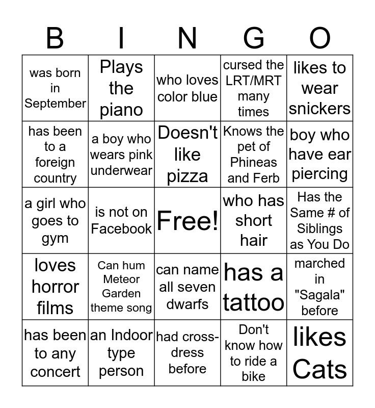 This bingo card has a free space and 24 words: has been to any concert, Can hum Meteor Garden theme song, Doesn't like pizza, Don't know how to ride a bike, likes to wear snickers, was born in September, Plays the piano, who loves color blue, who has short hair, Has the Same # of Siblings as You Do, a girl who goes to gym, a boy who wears pink underwear, has a tattoo, marched in "Sagala" before, has been to a foreign country, an Indoor type person, had cross-dress before, cursed the LRT/MRT many times, boy who have ear piercing, loves horror films, is not on Facebook, can name all seven dwarfs, Knows the pet of Phineas and Ferb and likes Cats.