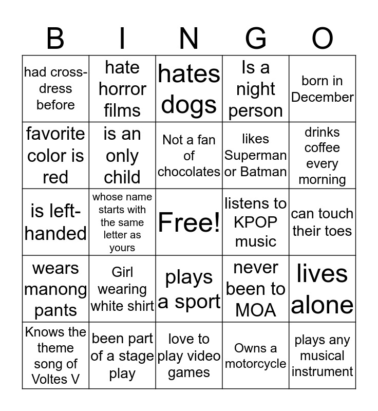 This bingo card has a free space and 24 words: Knows the theme song of Voltes V, Girl wearing white shirt, Not a fan of chocolates, Owns a motorcycle, born in December, had cross-dress before, hate horror films, hates dogs, listens to KPOP music, can touch their toes, is left-handed, is an only child, never been to MOA, lives alone, favorite color is red, been part of a stage play, love to play video games, Is a night person, drinks coffee every morning, wears manong pants, whose name starts with the same letter as yours, plays a sport, likes Superman or Batman and plays any musical instrument.