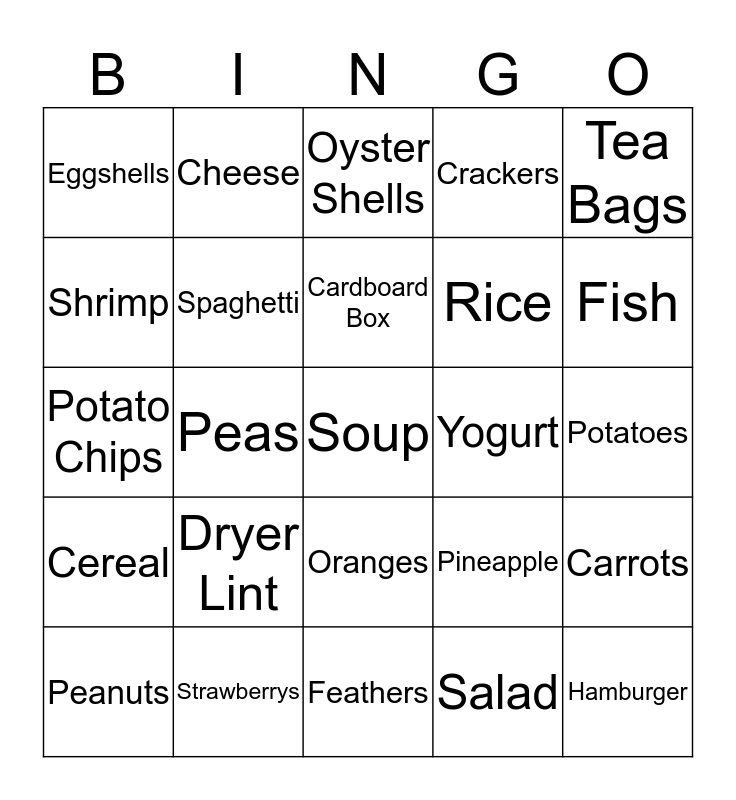 This bingo card has 51 words: Apple, Soup, Peach, Feathers, Dryer Lint, Hair, Cheese, Tomatoes, Shrimp, Salt and Pepper, Spaghetti, Crackers, Carrots, Pineapple, Meat, Watermelon, Cardboard Box, Yogurt, Dead Plants, Tea Bags, Peas, Salad, Eggshells, Rice, Macaroni and Cheese, Hamburger, Fish, Plastic Bottles, Peanuts, Oyster Shells, Bagel, Pizza, Cotton Candy, Peanut Butter, Newspaper, Strawberrys, Cake, Corn, Cotton T-shirt, Bananas, Potatoes, Cereal, Peanut Butter and Jelly, French Fries, Tin Cans, Milk, Potato Chips, Bread, Doughnuts, Oranges and Glass Bottles.