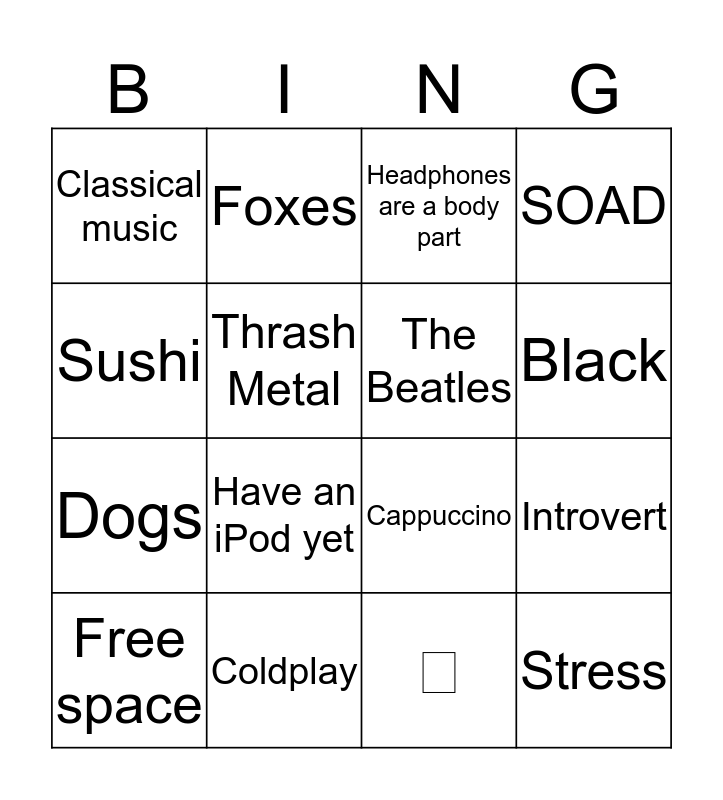 This bingo card has 16 words: Free space, Coldplay, Headphones are a body part, SOAD, Sushi, Foxes, Cappuccino, Introvert, Classical music, Thrash Metal, , Black, Dogs, Have an iPod yet, The Beatles and Stress.