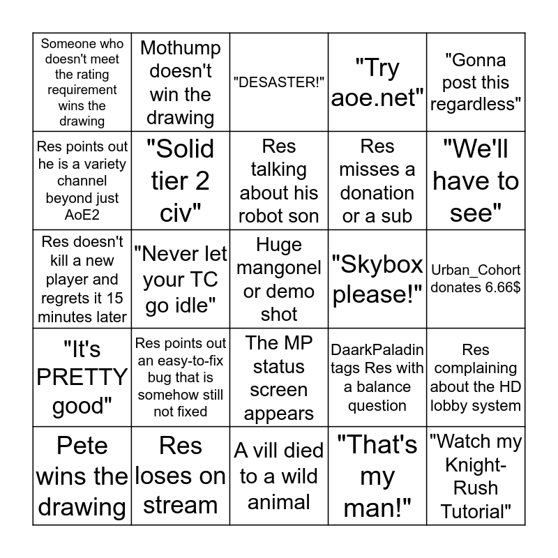 This bingo card has 33 words: "Watch my Knight-Rush Tutorial", "Make at least 100 vills every game", "Never let your TC go idle", "It's the bees knees", "It's PRETTY good", "Solid tier 2 civ", "Gonna post this regardless", Pete wins the drawing, Mothump doesn't win the drawing, "We got the best community on Twitch", Res talking about his robot son, "DESASTER!", Res spots a moonwalking unit, 1 hour after the stream started, the first game didn't start yet, "Skybox please!", "We'll have to see", Res loses on stream, Res doesn't kill a new player and regrets it 15 minutes later, Res points out an easy-to-fix bug that is somehow still not fixed, DaarkPaladin tags Res with a balance question, The MP status screen appears, Res does a random voice impression, Someone who doesn't meet the rating requirement wins the drawing, Urban_Cohort donates 6.66$, A vill died to a wild animal, Huge mangonel or demo shot, "Try aoe.net", Res misses a donation or a sub, Res points out he is a variety channel beyond just AoE2, Res complaining about the HD lobby system, Some random guy keeps joining the lobby called DONT JOIN, "That's my man!" and Res pans the camera away from a bad boar lure.