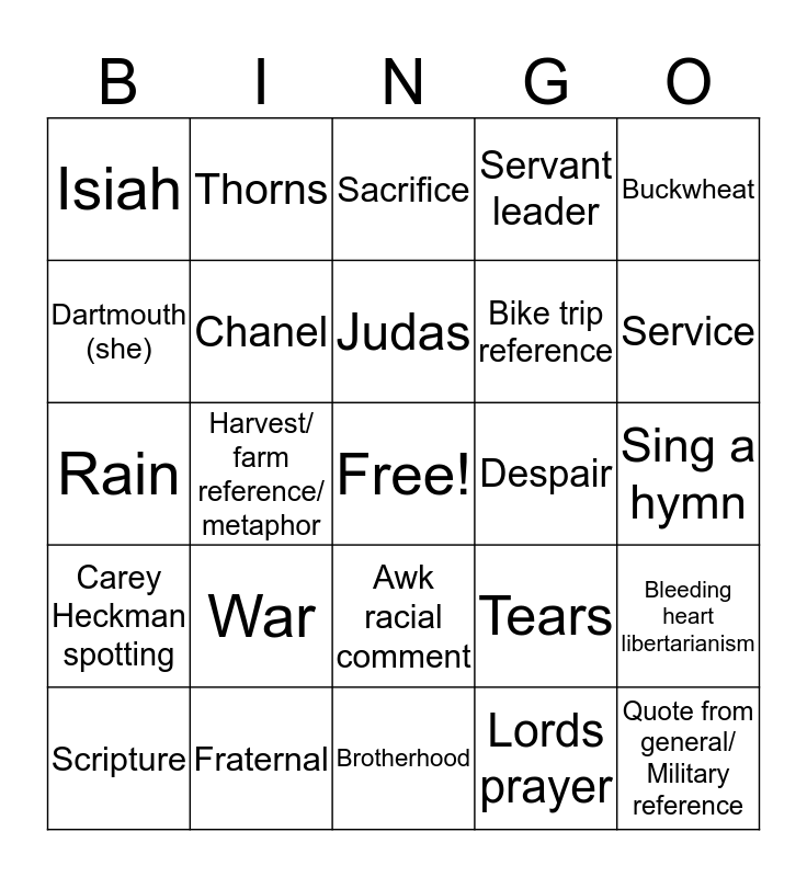 This bingo card has a free space and 24 words: Scripture, War, Judas, Lords prayer, Buckwheat, Isiah, Thorns, Sacrifice, Despair, Sing a hymn, Rain, Chanel, Tears, Bleeding heart libertarianism, Dartmouth (she), Fraternal, Brotherhood, Servant leader, Service, Carey Heckman spotting, Harvest/ farm reference/ metaphor, Awk racial comment, Bike trip reference and Quote from general/ Military reference.