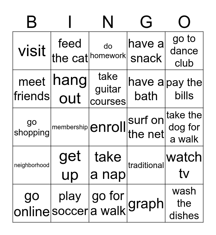This bingo card has 35 words: before school, after school, hang around, hang out, take a nap, have a snack, meet friends, have a rest, take guitar courses, do karate, go shopping, go to dance club, study lesson, tidy room, visit, surf on the net, graph, membership, neighborhood, enroll, traditional, go online, watch tv, play soccer, do homework, pay the bills, wash the dishes, take a shower, have a bath, take the dog for a walk, come back home, go for a walk, get up, feed the cat and have breakfast.