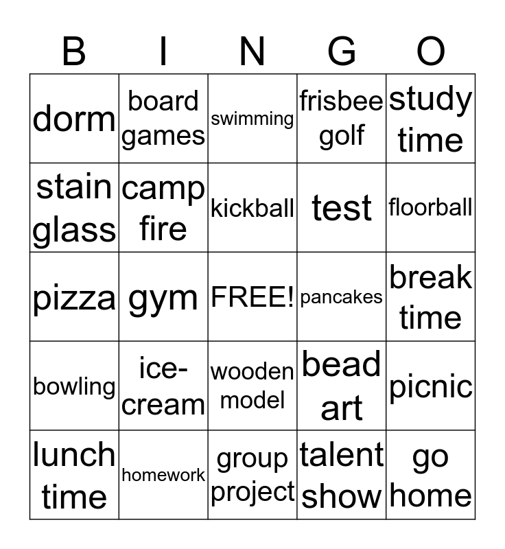 This bingo card has a free space and 24 words: ice-cream, homework, kickball, lunch time, study time, dorm, stain glass, board games, pancakes, wooden model, test, pizza, bead art, picnic, camp fire, talent show, break time, swimming, floorball, gym, go home, bowling, frisbee golf and group project.