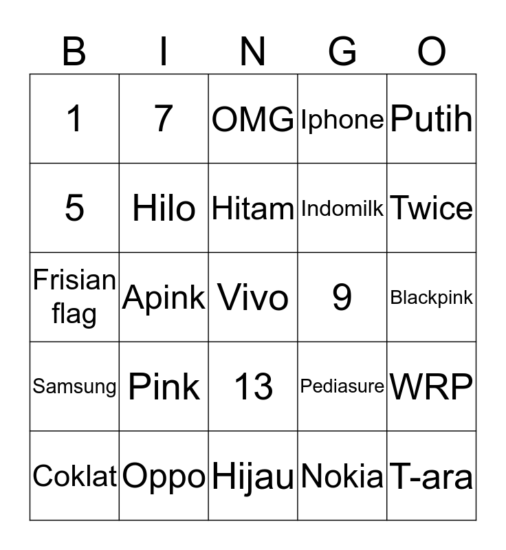 This bingo card has 25 words: Pink, Hijau, Hitam, Coklat, Putih, 1, 5, 7, 9, 13, Indomilk, Frisian flag, Pediasure, WRP, Hilo, T-ara, Blackpink, OMG, Twice, Apink, Vivo, Oppo, Samsung, Iphone and Nokia.
