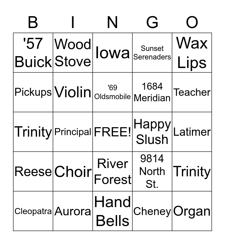 This bingo card has a free space and 24 words: Choir, Aurora, '69 Oldsmobile, Cleopatra, Wax Lips, '57 Buick, Pickups, Wood Stove, Happy Slush, River Forest, 1684 Meridian, Trinity, 9814 North St., Trinity, Violin, Cheney, Latimer, Iowa, Teacher, Principal, Organ, Reese, Sunset Serenaders and Hand Bells.