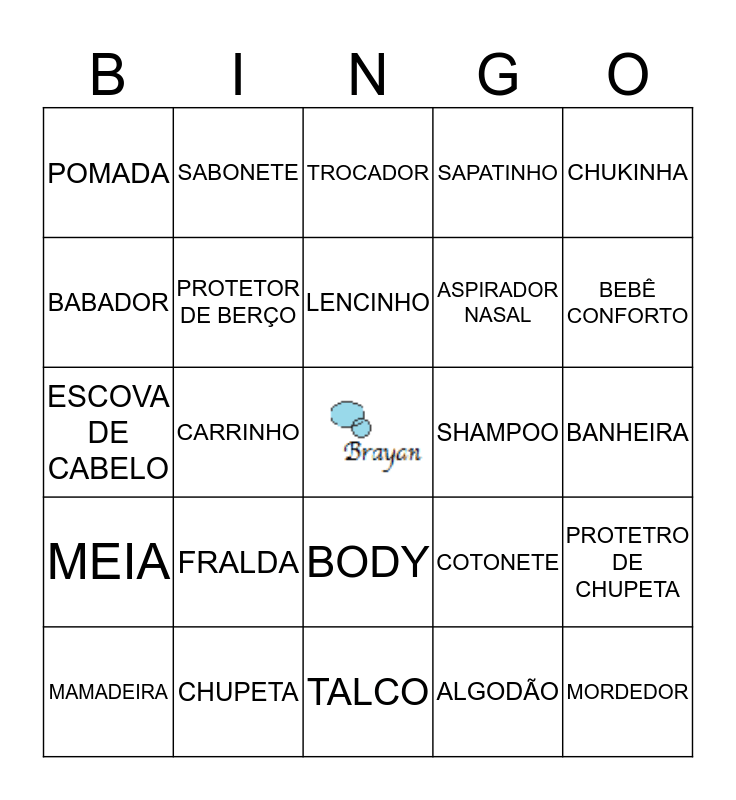 This bingo card has a free space and 24 words: FRALDA, CHUPETA, LENCINHO, MAMADEIRA, CHUKINHA, POMADA, BABADOR, SABONETE, SHAMPOO, BODY, ASPIRADOR NASAL, ESCOVA DE CABELO, COTONETE, PROTETRO DE CHUPETA, PROTETOR DE BERÇO, ALGODÃO, BANHEIRA, TROCADOR, BEBÊ CONFORTO, CARRINHO, MORDEDOR, MEIA, SAPATINHO and TALCO.