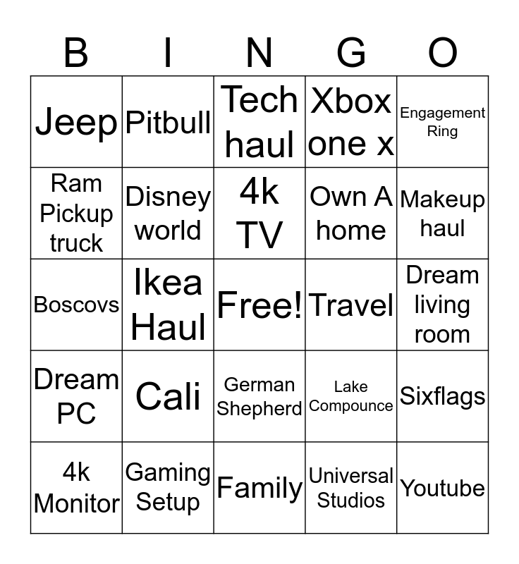 This bingo card has a free space and 24 words: Cali, Gaming Setup, 4k TV, 4k Monitor, Engagement Ring, Jeep, Ram Pickup truck, Pitbull, Travel, German Shepherd, Own A home, Boscovs, Lake Compounce, Sixflags, Disney world, Universal Studios, Dream living room, Tech haul, Makeup haul, Ikea Haul, Youtube, Dream PC, Xbox one x and Family.