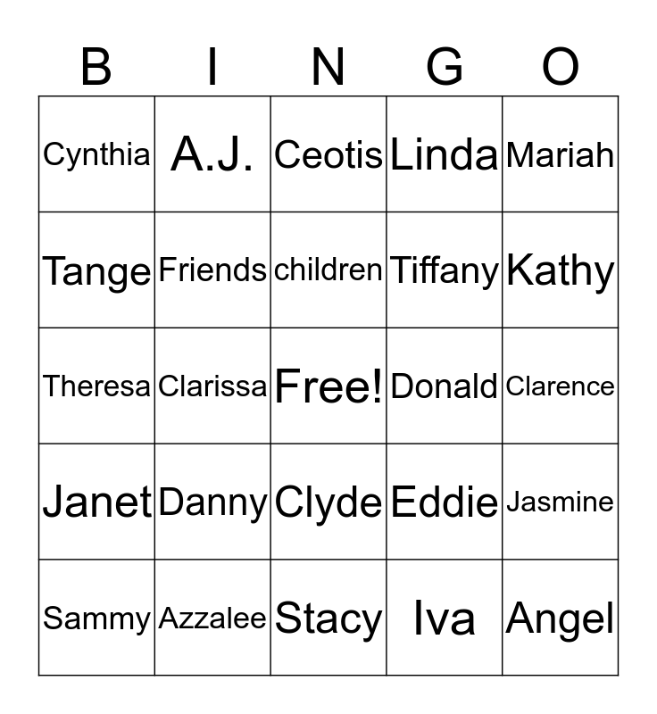 This bingo card has a free space and 29 words: Sammy, Pollie, Clarissa, Coretta, Cynthia, Ceotis, Friends, Danny, Donald, Azzalee, Clarence, Angel, Stacy, Iva, Kathy, Freddie, Clyde, Janet, Mariah, Theresa, Eddie, Delores, Tiffany, Tange, Linda, A.J., Jasmine, children and Miki.