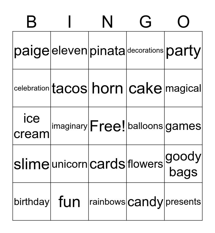 This bingo card has a free space and 25 words: unicorn, rainbows, horn, birthday, party, paige, celebration, eleven, balloons, cards, cake, ice cream, flowers, goody bags, tacos, streamers, games, pinata, magical, imaginary, presents, fun, slime, decorations and candy.