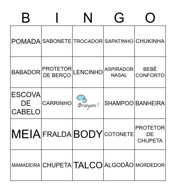 This bingo card has a free space and 24 words: FRALDA, CHUPETA, LENCINHO, MAMADEIRA, CHUKINHA, POMADA, BABADOR, SABONETE, SHAMPOO, BODY, ASPIRADOR NASAL, ESCOVA DE CABELO, COTONETE, PROTETOR DE CHUPETA, PROTETOR DE BERÇO, ALGODÃO, BANHEIRA, TROCADOR, BEBÊ CONFORTO, CARRINHO, MORDEDOR, MEIA, SAPATINHO and TALCO.