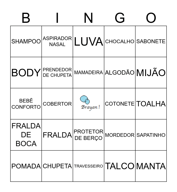 This bingo card has a free space and 24 words: FRALDA, CHUPETA, MAMADEIRA, POMADA, SABONETE, SHAMPOO, BODY, ASPIRADOR NASAL, COTONETE, PROTETOR DE BERÇO, ALGODÃO, BEBÊ CONFORTO, MORDEDOR, SAPATINHO, PRENDEDOR DE CHUPETA, TALCO, TOALHA, LUVA, MIJÃO, COBERTOR, MANTA, FRALDA DE BOCA, CHOCALHO and TRAVESSEIRO.