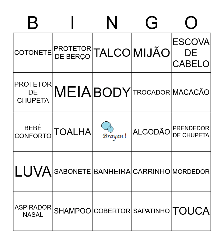 This bingo card has a free space and 24 words: SABONETE, SHAMPOO, BODY, ASPIRADOR NASAL, ESCOVA DE CABELO, COTONETE, PROTETOR DE CHUPETA, PROTETOR DE BERÇO, ALGODÃO, BANHEIRA, TROCADOR, BEBÊ CONFORTO, CARRINHO, MORDEDOR, MEIA, SAPATINHO, PRENDEDOR DE CHUPETA, TALCO, MACACÃO, TOALHA, TOUCA, LUVA, MIJÃO and COBERTOR.