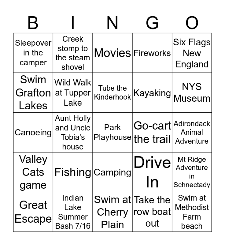 This bingo card has 25 words: Fishing, Swim at Cherry Plain, Tube the Kinderhook, Great Escape, Six Flags New England, Sleepover in the camper, Swim Grafton Lakes, Creek stomp to the steam shovel, Go-cart the trail, Camping, Kayaking, Canoeing, Drive In, Mt Ridge Adventure in Schnectady, Wild Walk at Tupper Lake, Swim at Methodist Farm beach, Adirondack Animal Adventure, Movies, NYS Museum, Aunt Holly and Uncle Tobia's house, Park Playhouse, Indian Lake Summer Bash 7/16, Valley Cats game, Fireworks and Take the row boat out.