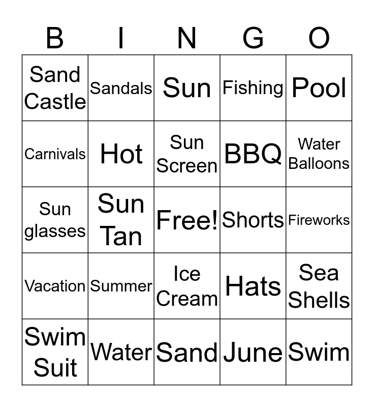 This bingo card has a free space and 24 words: Summer, Water, Sun Screen, Swim Suit, Pool, Sand Castle, Carnivals, Sandals, Shorts, Ice Cream, BBQ, Sun glasses, Hats, Sea Shells, Hot, June, Fireworks, Sun, Water Balloons, Sun Tan, Swim, Vacation, Fishing and Sand.