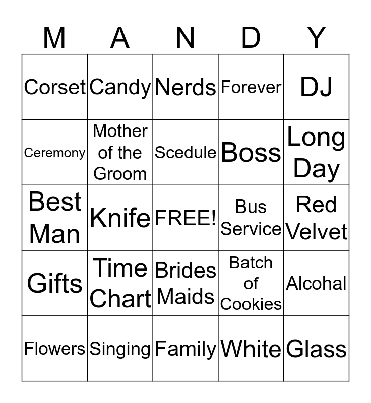 This bingo card has a free space and 24 words: Time Chart, Singing, Scedule, Flowers, DJ, Corset, Ceremony, Candy, Bus Service, Brides Maids, Boss, Best Man, Batch of Cookies, Alcohal, Mother of the Groom, White, Red Velvet, Nerds, Long Day, Knife, Glass, Gifts, Forever and Family.