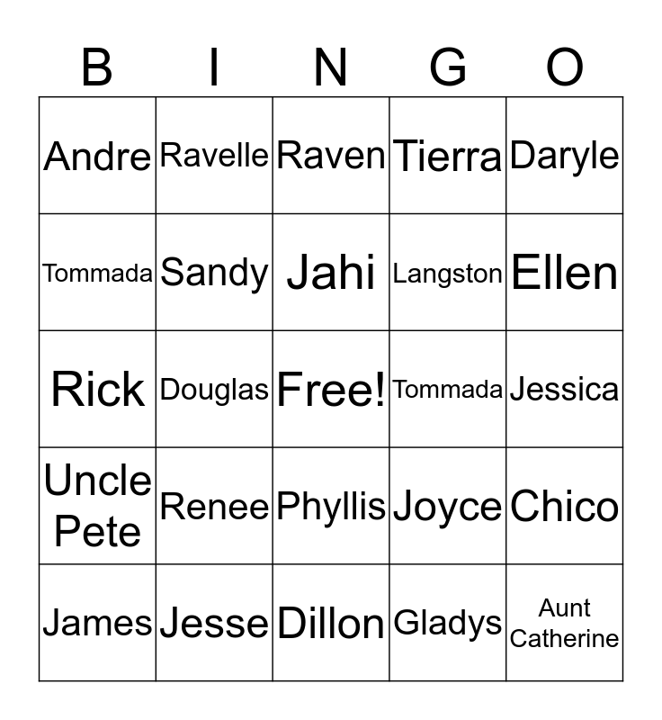 This bingo card has a free space and 30 words: Jesse, Donnie, Douglas, Jaime, Andre, Raven, Sandy, Phyllis, Tommada, Dillon, Jessica, Aunt Catherine, Gladys, Mildred, Ellen, Samara, Joyce, Uncle Pete, Renee, Daryle, Rick, Maurice, Ravelle, Langston, Tommada, Tierra, Chico, James, Jahi and Priya.