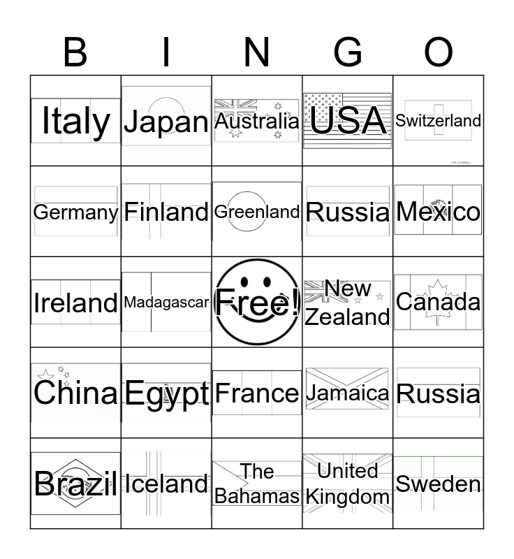 This bingo card has 24 images, a free space and 24 words: Egypt, Iceland, Greenland, Brazil, Switzerland, Italy, Germany, Japan, New Zealand, France, Russia, Ireland, Jamaica, Russia, Finland, United Kingdom, Canada, Australia, Mexico, Madagascar, Sweden, China, USA and The Bahamas.