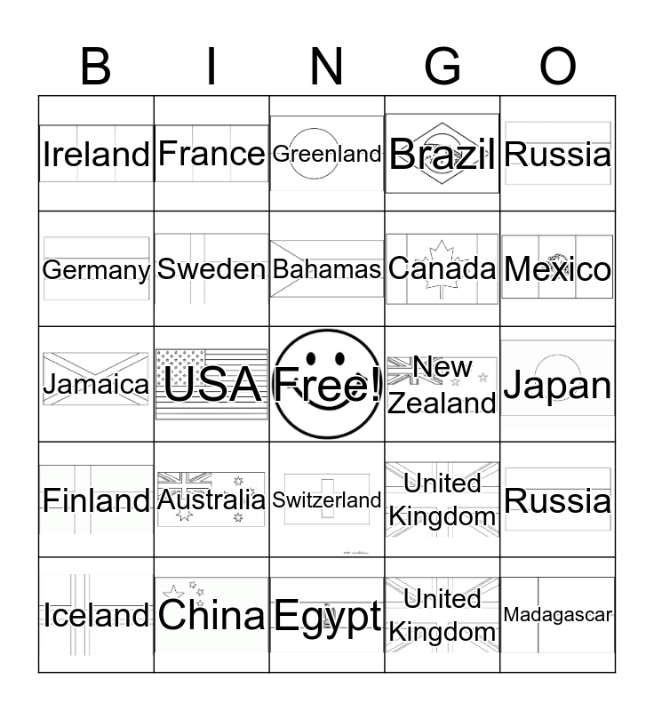 This bingo card has 24 images, a free space and 24 words: Australia, China, Bahamas, Iceland, Russia, Ireland, Germany, France, New Zealand, Switzerland, Canada, Jamaica, United Kingdom, Russia, Sweden, United Kingdom, Japan, Greenland, Mexico, USA, Madagascar, Finland, Brazil and Egypt.
