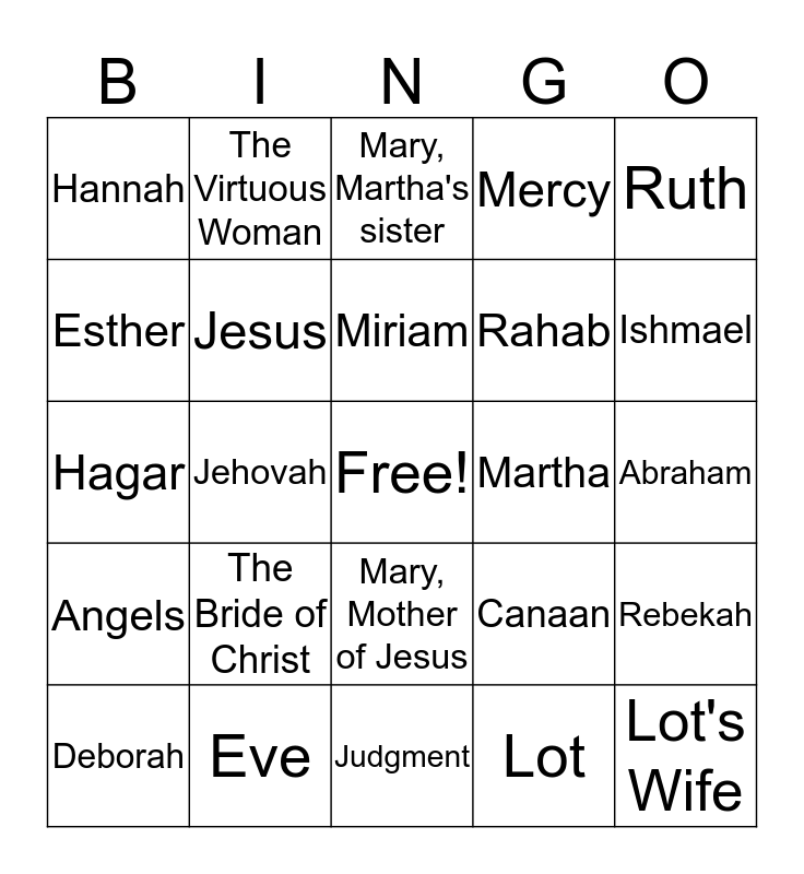 This bingo card has a free space and 24 words: The Bride of Christ, Eve, Miriam, Deborah, Ruth, Hannah, Esther, The Virtuous Woman, Martha, Mary, Mother of Jesus, Rahab, Hagar, Canaan, Rebekah, Jesus, Lot, Abraham, Mary, Martha's sister, Ishmael, Jehovah, Lot's Wife, Angels, Mercy and Judgment.
